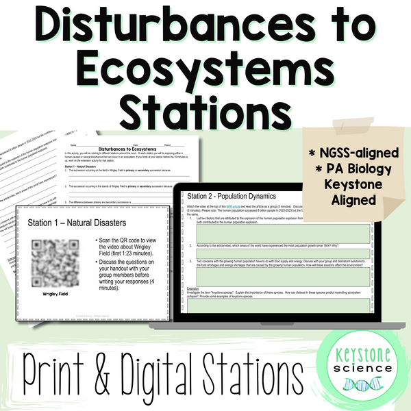 Get your students up and moving around with a stations activity to expand their knowledge and understanding of natural and human-caused disturbances to the environment. Students will read, watch, or listen to online resources to explore natural disasters, succession, population dynamics, invasive species, climate change, and pollution and analyze how humans can lessen our impact on Earth. Available as print or digital to fit your classroom needs!