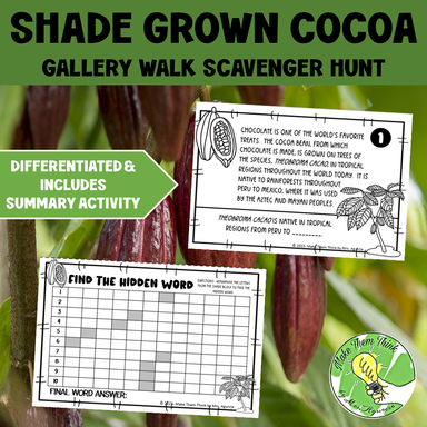 Chocolate is one of the world's favorite treats. Through a motivating challenge to find the hidden word in this gallery walk scavenger hunt, your students to learn how it can be grown in a sustainable way, through shade-grown cocoa plantations. Differentiated options and a summary activity are included.