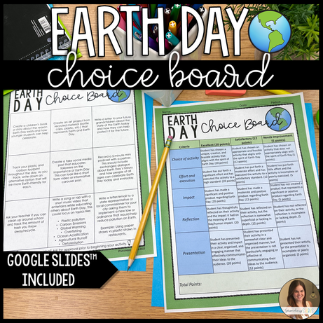 This choice board project allows students to choose an Earth Day project of their choice. The differentiation of activities provides students with autonomy in their learning and presentation of knowledge. The project will assess knowledge of Human Impact on Earth and the importance of celebrating Earth Day. Perfect for a middle school science class.